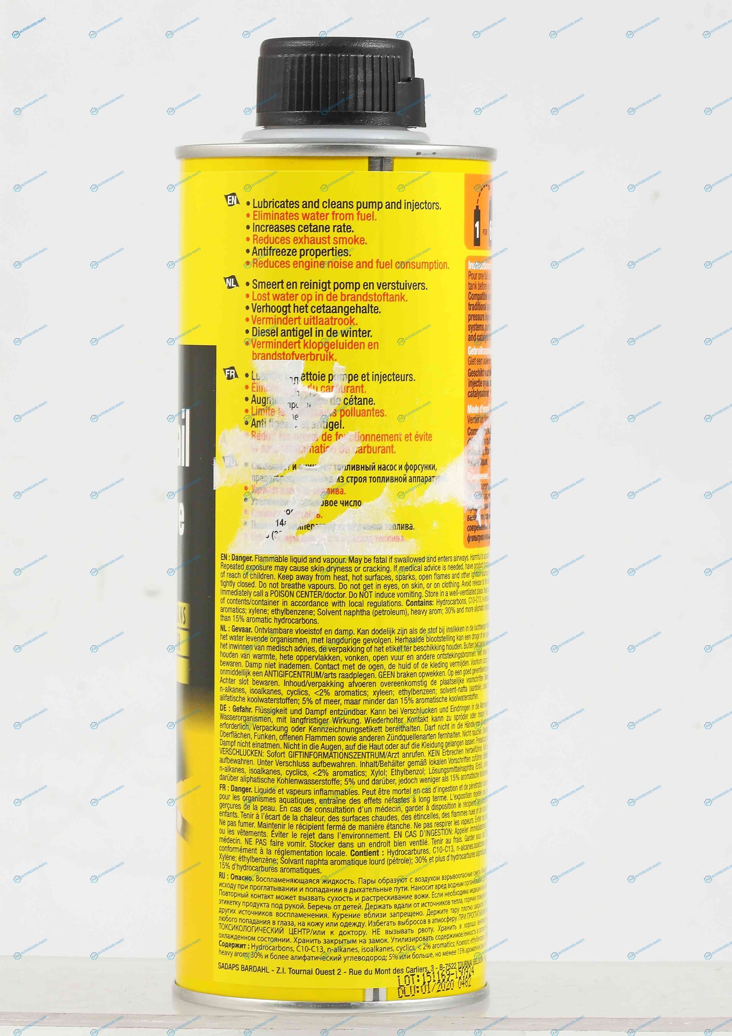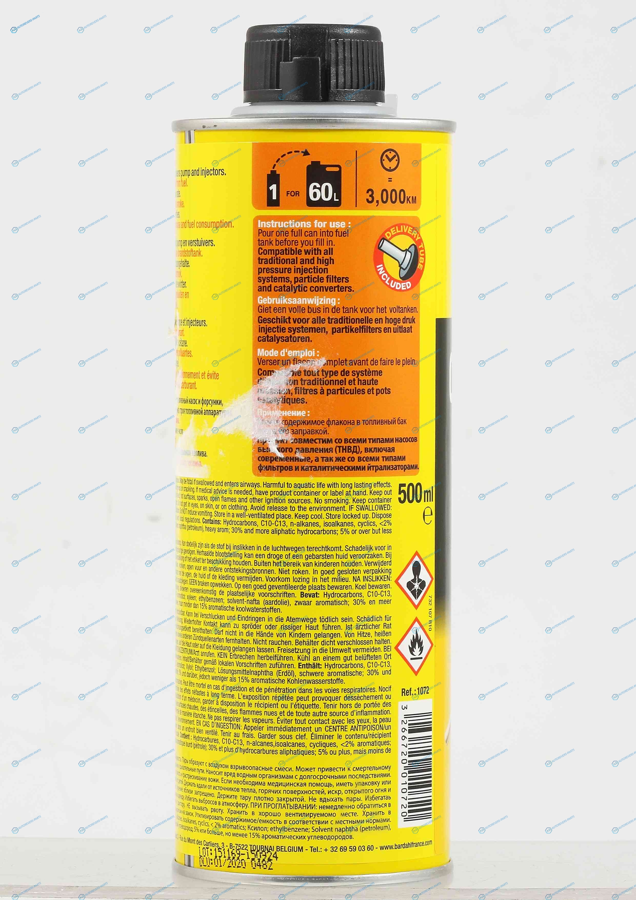 Описание:BARDAHL COMMON RAIL DIESEL ADDITIVE– специально разработанная профилактическая присадка для дизельного топлива. Предназначенная для защиты системы впрыска от износа. Подходит для частого применения и для любого типа дизельного двигателя. Совместима со всеми системами впрыска высокого давления. (HDI. CDI. TDC. DCI). системой DPF и каталитическим нейтрализатором. Смазывает верхнюю часть цилиндров и поршневых колец. Защищает клапаны и их седла от износа. Увеличивает цетановое число Удаляет влагу из топлива. Снижает температуру замерзания топлива. Делает холодный пуск двигателя легче. Смазывает и очищает топливный насос и форсунки. Снижает шум двигателя и расход топлива. Снижает дымность выхлопа. | Способ применения:Залейте присадку в топливный бак перед заправкой. из расчета 1 флакон (500мл) на 60л. Топлива | Высота [мм]:200 | Глубина [мм]:66 | Ширина [мм]:66