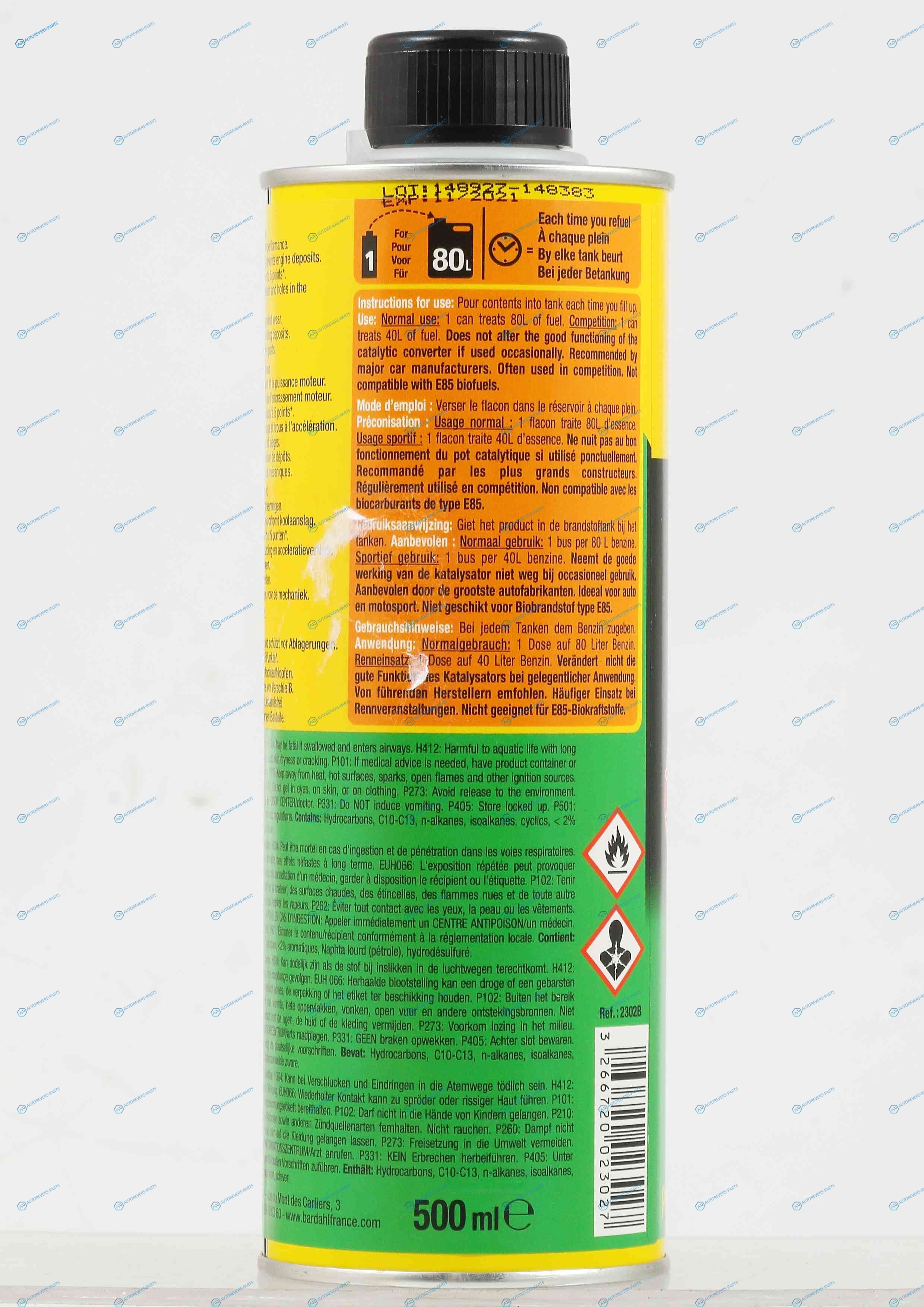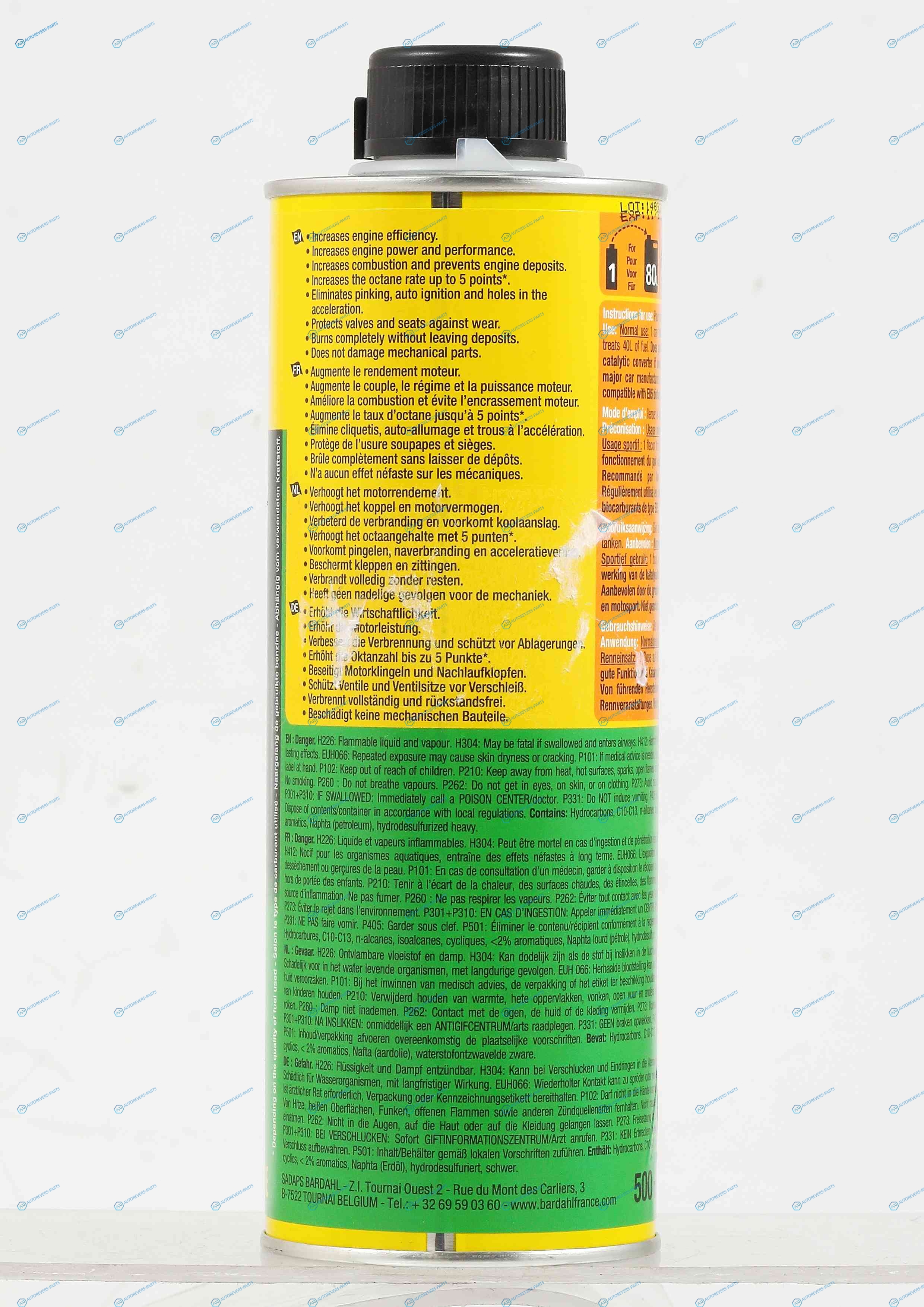 Описание:BARDAHL OCTANE BOOSTER – Высокоэффективный продукт для увеличения октанового числа бензинового топлива до 5 единиц. Совместим с любым бензиновым двигателем и с любым типом бензинового топлива. Увеличивает октановое число максимум на 5 единиц. в зависимости от качества обрабатываемого топлива. Повышает отдачу двигателя. Увеличивает мощность и приемистость двигателя. Улучшает сгорание топлива и предотвращает образование отложений в двигателе. Устраняет толчки. детонацию и провалы при ускорении. Защищает клапаны и их седла от износа. | Способ применения:Залейте присадку в топливный бак перед заправкой. Для повседневного использования: 1 флакон (500мл) рассчитан на 80л. топлива Для спортивного использования: 1 флакон (500мл) рассчитан на 40л. топлива