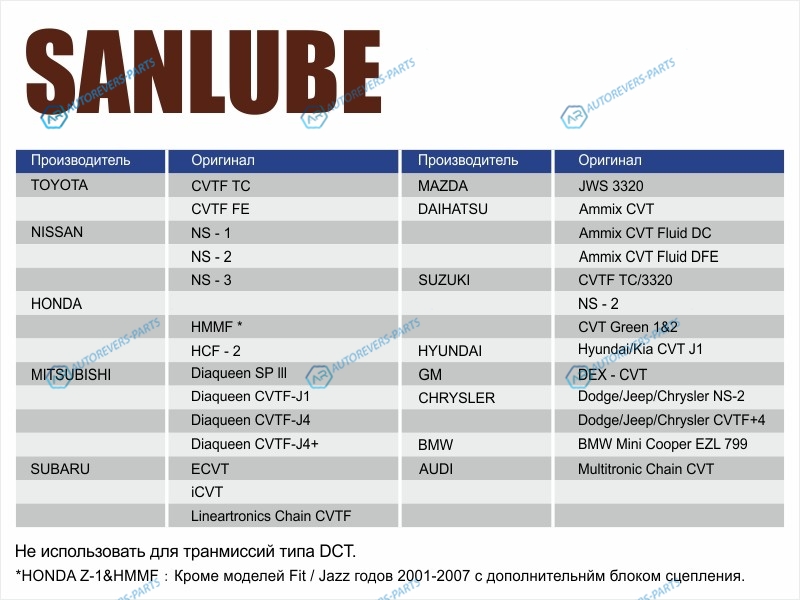 Купить SAN-CVTFC Масло трансмиссионное синтетическое SANLUBE CVT 4л SANLUBE на автомобили и оформить заказ вы можете у нас на сайте или позвонить нашему консультанту.