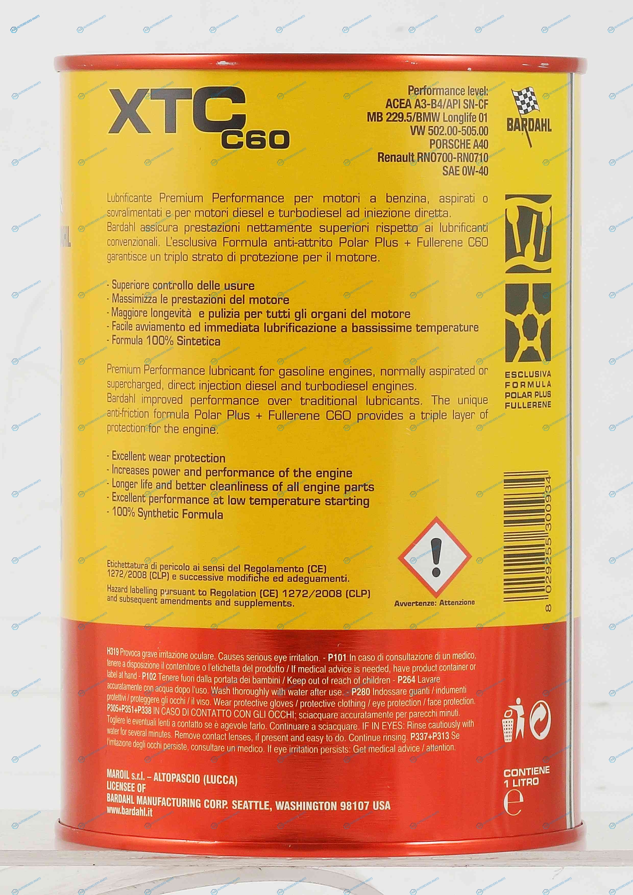 Описание:XTC C60 0W40 AUTO .Премиальное. полностью синтетическое моторное масло высшего качества для любых бензиновых и дизельных двигателей легковых автомобилей в т.ч. с турбонаддувом и непосредственным впрыском. За счет наличия в своем составе уникальной противоизносной и антифрикционной формулы Bardahl Polar Plus + Fullerene C60 Bardahl XTC C60 0W40 AUTO дает тройной уровень защиты и позволяет максимально использовать потенциал двигателя: поверхностная смазывающая пленка самого масла. полярно заряженные молекулы Polar Plus способные прочно прилипать к металлическим поверхностям двигателя. создавая постоянный защитный барьер. молекулы C60. которые ведут себя как микро-шарикоподшипники. заполняя собой все микротрещины и полости между металлическими поверхностями двигателя. создавая дополнительный слой защиты от трения. Bardahl XTC C60 0W40 обеспечивает более высокую производительность по сравнению с обычными моторными маслами.. | Спецификации:ACEA A3B4 API SN-CF MB 229.5 BMW longlife 01 VW 502.00505.00 PORSCHE A40 Renault RN 0700-RN0710 | Высота [мм]:110 | Глубина [мм]:110 | Ширина [мм]:150