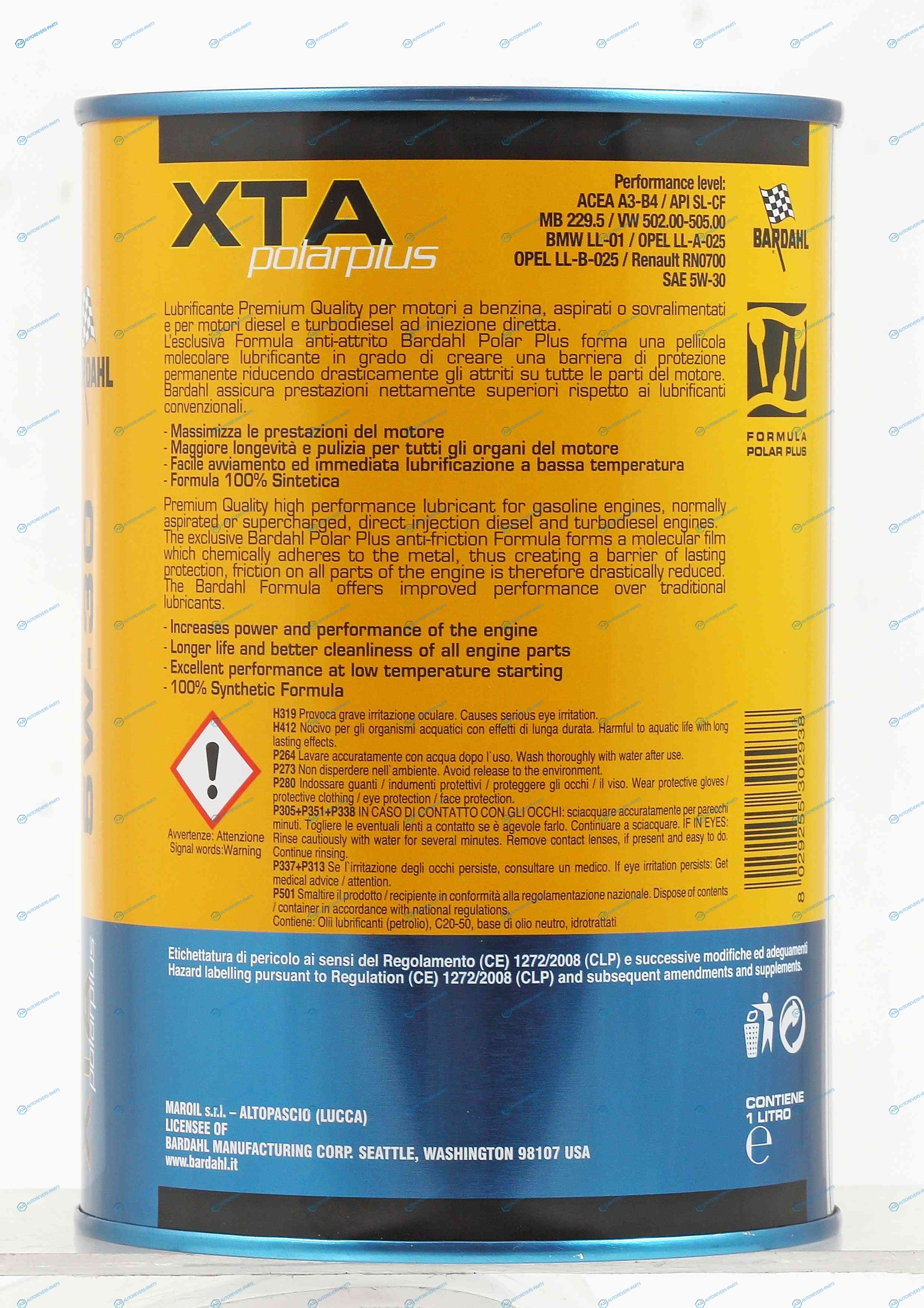 Описание:XTA POLAR PLUS 5W30 A3-B4 .Премиальное. 100% синтетическое моторное масло высшего качества для любых бензиновых и дизельных двигателей. легковых автомобилей в т.ч. с турбонаддувом и непосредственным впрыском. Благодаря. наличию уникальной противоизносной формулы Bardahl Polar Plus. полярно заряженные молекулы способны прочно прилипать к металлическим поверхностям двигателя и создавать постоянный защитный барьер. который защищает металл не только от трения. но и от коррозии. Bardahl XTA POLAR PLUS 5W30 обеспечивает более высокую производительность по сравнению с обычными моторными маслами. . | Спецификации:ACEA A3B4 API SL-CF MB 229.5 BMW longlife 01 VW 502.00505.00 Opel LL-B-025 - B025 Renault RN 0700-RN0710 | Высота [мм]:146 | Глубина [мм]:102 | Ширина [мм]:102
