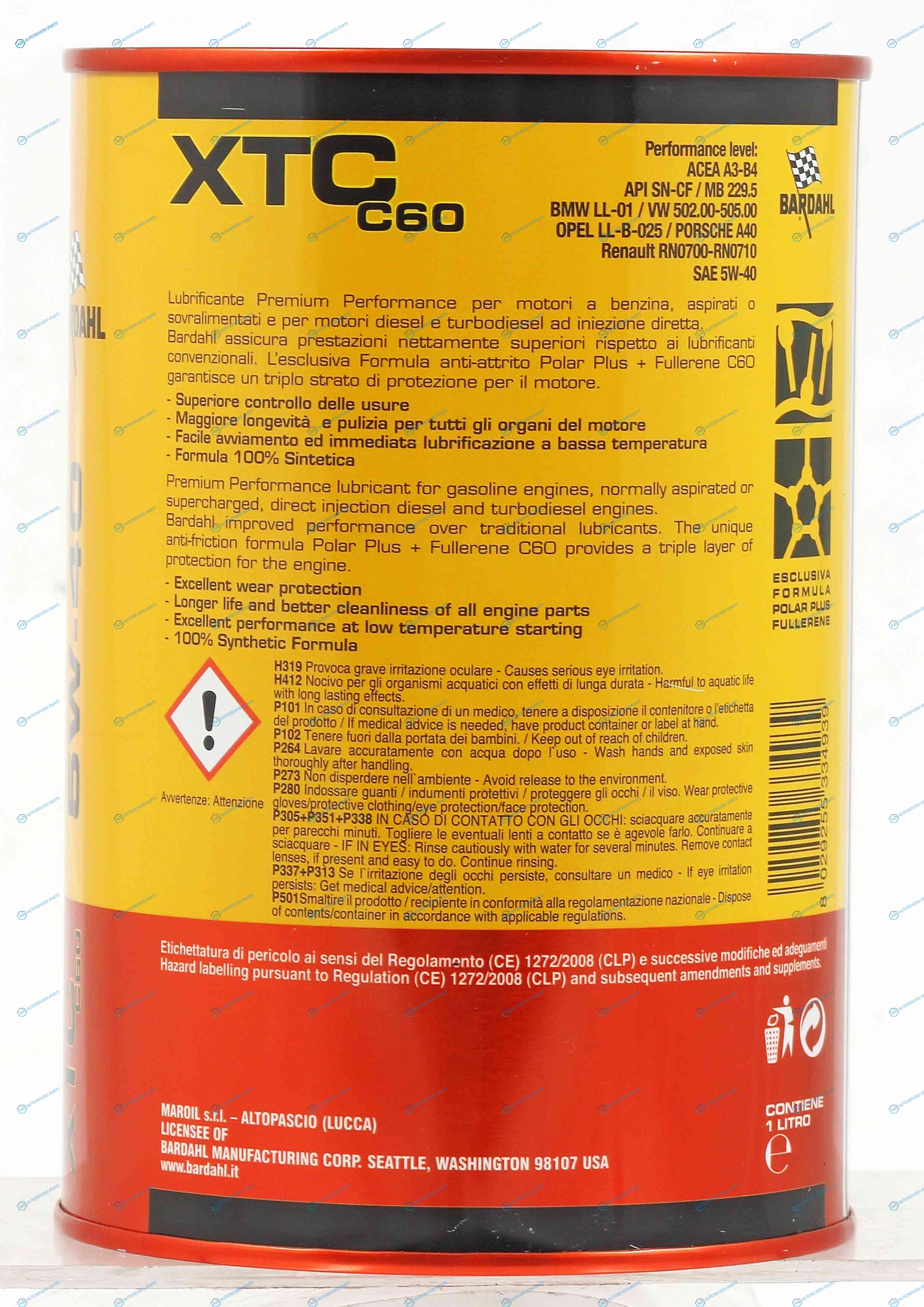 Описание:XTC C60 5W40 AUTO .Премиальное. полностью синтетическое моторное масло высшего качества для любых бензиновых и дизельных двигателей легковых автомобилей в т.ч. с турбонаддувом и непосредственным впрыском. За счет наличия в своем составе уникальной противоизносной и антифрикционной формулы Bardahl Polar Plus + Fullerene C60 Bardahl XTC C60 5W40 AUTO дает тройной уровень защиты и позволяет максимально использовать потенциал двигателя: поверхностная смазывающая пленка самого масла. полярно заряженные молекулы Polar Plus способные прочно прилипать к металлическим поверхностям двигателя. создавая постоянный защитный барьер. молекулы C60. которые ведут себя как микро-шарикоподшипники. заполняя собой все микротрещины и полости между металлическими поверхностями двигателя. создавая дополнительный слой защиты от трения. Bardahl XTC C60 5W40 обеспечивает более высокую производительность по сравнению с обычными моторными маслами.. | Спецификации:ACEA A3B4 API SN-CF MB 229.5 BMW longlife 01 VW 502.00505.00 Opel LL-B-025 PORSCHE A40 Renault RN 0700-RN0710 | Высота [мм]:148 | Глубина [мм]:102 | Ширина [мм]:102
