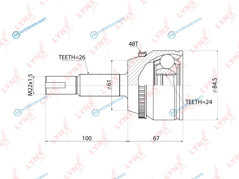 Сторона установки:со стороны колеса | Внешнее зацепление со стороны колеса:26 | Внутренне зубчатое соединение со стороны колеса:24 | Диаметр прокладки [мм]:61 | Число зубцов кольца ABS:48 | Длина [мм]:167 | Длина 1 [мм]:100 | Длина 2 [мм]:67 | Спецификация:Middle Groove