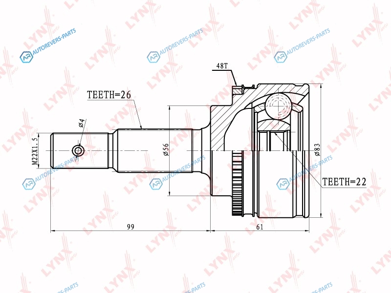 Сторона установки:со стороны колеса | Внешнее зацепление со стороны колеса:26 | Внутренне зубчатое соединение со стороны колеса:22 | Диаметр прокладки [мм]:56 | Число зубцов кольца ABS:48 | Длина [мм]:160 | Длина 1 [мм]:99 | Длина 2 [мм]:61 | Спецификация:Middle Groove