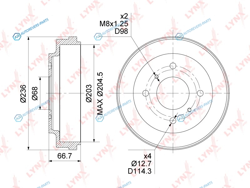 ? фаски [мм]:114.3 | Количество отверстий:4 | Внутрен. высота торм. барабана [мм]:43.5 | Общ. высота торм. барабана [мм]:66.5 | Макс. размер расточки тормозного барабана [мм]:204.5 | Диаметр барабана:203 | Наружн. диаметр торм. барабана (мм):236 | Сторона установки:задний мост