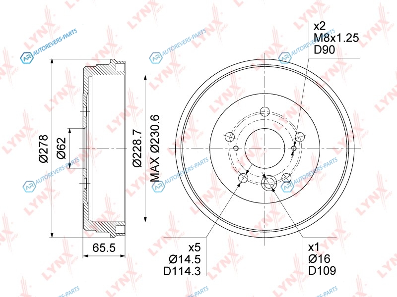 Сторона установки:задний мост | Наружн. диаметр торм. барабана (мм):277.5 | Диаметр барабана:228.5 | Макс. размер расточки тормозного барабана [мм]:230.5 | Общ. высота торм. барабана [мм]:64 | Внутрен. высота торм. барабана [мм]:55 | Количество отверстий:5 | ? фаски [мм]:114.3