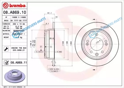 для артикула №:08.A869.10 | Тип тормозного диска:полный | Диаметр [мм]:262 | Толщина тормозного диска (мм):10 | Минимальная толщина [мм]:8.4 | Высота [мм]:61.1 | Диаметр центрирования [мм]:76 | Количество отверстий:5 | Момент затяжки [Нм]:100 | Дополнительный артикул дополнительная информация 2:с винтами | Наружный диаметр [мм]:262 | Высота [мм]:70 | Глубина [мм]:282 | Ширина [мм]:279
