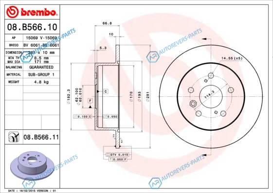 для артикула №:08.B566.11 | Тип тормозного диска:полный | Диаметр [мм]:281 | Толщина тормозного диска (мм):10 | Минимальная толщина [мм]:8.5 | Высота [мм]:66.8 | Диаметр центрирования [мм]:62 | Количество отверстий:5 | Поверхность:с покрытием | Наружный диаметр [мм]:281