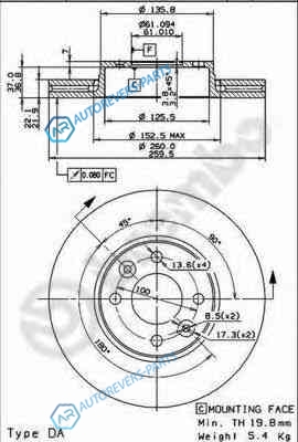 для артикула №:09.9078.11 | Тип тормозного диска:с внутренней вентиляцией | Диаметр [мм]:260 | Толщина тормозного диска (мм):22 | Минимальная толщина [мм]:19.8 | Высота [мм]:44 | Диаметр центрирования [мм]:61 | Количество отверстий:4 | Момент затяжки [Нм]:105 | Поверхность:с покрытием | Дополнительный артикул дополнительная информация 2:с винтами | Наружный диаметр [мм]:260 | Высота [мм]:52 | Глубина [мм]:262 | Ширина [мм]:264