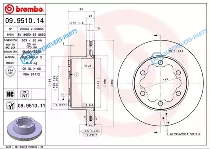 для артикула №:09.9510.14 | Тип тормозного диска:с внутренней вентиляцией | Диаметр [мм]:303 | Толщина тормозного диска (мм):28 | Минимальная толщина [мм]:25 | Высота [мм]:93 | Обработка:Высокоуглеродистый | Диаметр центрирования [мм]:120 | Количество отверстий:6 | Момент затяжки [Нм]:175 | Наружный диаметр [мм]:303 | Высота [мм]:126 | Глубина [мм]:316 | Ширина [мм]:310