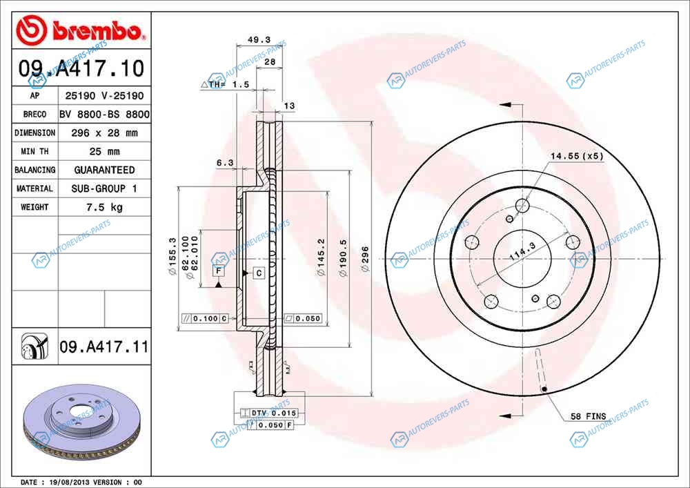 для артикула №:09.A417.11 | Тип тормозного диска:с внутренней вентиляцией | Диаметр [мм]:296 | Толщина тормозного диска (мм):28 | Минимальная толщина [мм]:25 | Высота [мм]:49.3 | Диаметр центрирования [мм]:62 | Количество отверстий:5 | Момент затяжки [Нм]:103 | Поверхность:с покрытием | Наружный диаметр [мм]:296 | Высота [мм]:65 | Глубина [мм]:312 | Ширина [мм]:307