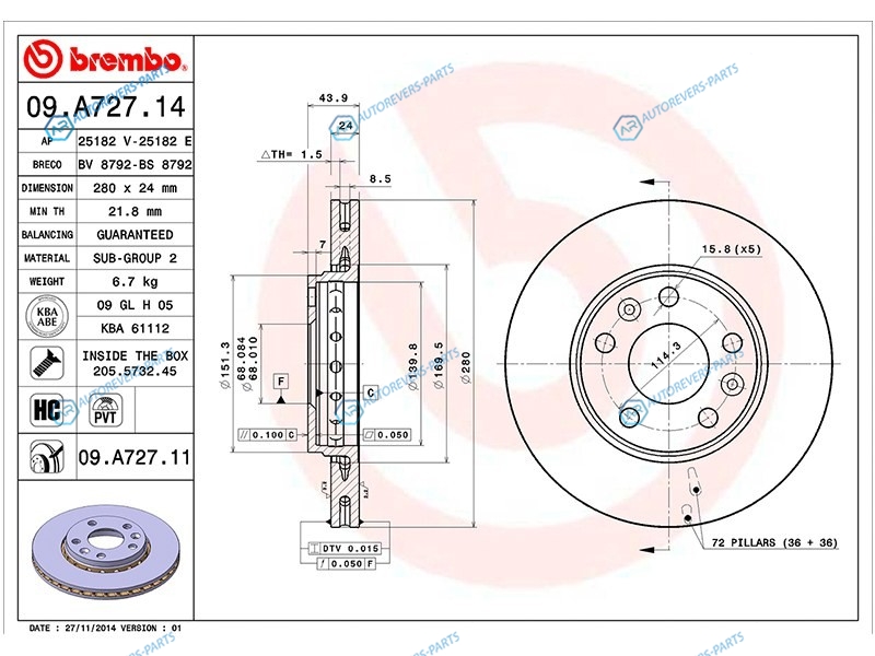 Купить 09.A727.14 Диск тормозной перед RENAULT DUSTER 10-KAPTUR 17-FLUENCE 09-ARKANA 18- Brembo на автомобили RENAULT DUSTER 10-21 | RENAULT FLUENCE 10-17 | RENAULT LAGUNA 07- и оформить заказ вы можете у нас на сайте или позвонить нашему консультанту.