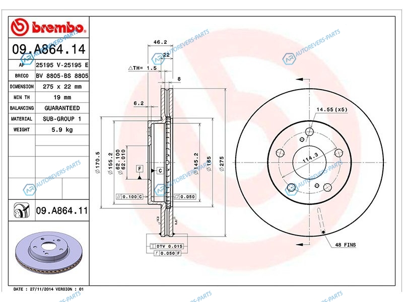 Диск тормозной перед TOYOTA AurisCorolla SED. ZZE150ZRE151 (EU). NZE15ZRE15 (JP). 06-