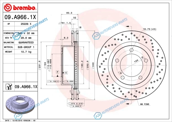 для артикула №:09.A966.1X | Тип тормозного диска:с отверстиямис внутр. вентиляцией | Диаметр [мм]:340 | Толщина тормозного диска (мм):32 | Минимальная толщина [мм]:29.8 | Высота [мм]:83.3 | Диаметр центрирования [мм]:112 | Количество отверстий:5 | Момент затяжки [Нм]:112 | Поверхность:с покрытием | Описание:Диски Brembo XTRA Новый модельный ряд тормозных дисков Brembo Xtra. характеризующийся специальными отверстиями. сочетает в себе привлекательный внешний вид с блестящей производительностью и эффективным торможением в любых условиях. Разработанный научно-исследовательским департаментом на основе опыта работы с производителями автомобилей и гоночным миром. ассортимент Brembo Xtra отличается отверстиями на тормозной поверхности. которые позволяют обеспечить значительное улучшение в производительности тормозной системы. Спортивный вид Brembo Xtra. усиленный благодаря окрашиванию по УФ-технологии. в сочетании с гарантией максимальной надежности. долговечности. производительности и безопасности. Каждому свой Xtra! Для того чтобы получить мощный и безопасный продукт. на этапе проектирования технические специалисты Brembo изучали количество. размер. форму и положение каждого отверстия для каждого конкретного тормозного диска серии Xtra. Диски Brembo Xtra прошли все тесты на динамометрическом стенде. а также дорожные испытания. Компактные. средние. купе и SUV модели автомобилей – вот некоторые из применений. выбранных для серии Brembo Xtra. Результатом стал наиболее полный и обновленный ассортимент спортивных тормозных дисков. доступных на рынке. XTRA ПРОИЗВОДИТЕЛЬНОСТЬ Очистка и восстановление колодки Отверстия оказывают эффект «терки». очищая поверхность колодки от отложений опасных материалов. предотвращая тем самым накопление даже малейшего количества железосодержащего материала. появляющегося от износа тормозного диска. на фрикционном материале тормозной колодки. Эффективность «мокрого» торможения Отверстия служат для предотвращения появления водной пленки на поверхности торможения. Даже при движении по мокрым дорогам тормозная система эффективно реагирует уже при первом торможении. Охлаждение тормозной системы Наличие отверстий приводит к большей циркуляции воздуха. в результате чего улучшается способность рассеивания тепла. повышающая производительность системы. | Наружный диаметр [мм]:340 | Высота [мм]:106 | Глубина [мм]:390 | Ширина [мм]:390