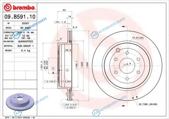 для артикула №:09.B591.10 | Тип тормозного диска:с внутренней вентиляцией | Диаметр [мм]:308 | Толщина тормозного диска (мм):18 | Минимальная толщина [мм]:16 | Высота [мм]:63 | Диаметр центрирования [мм]:68 | Количество отверстий:6 | Наружный диаметр [мм]:308 | Высота [мм]:77 | Глубина [мм]:332 | Ширина [мм]:328