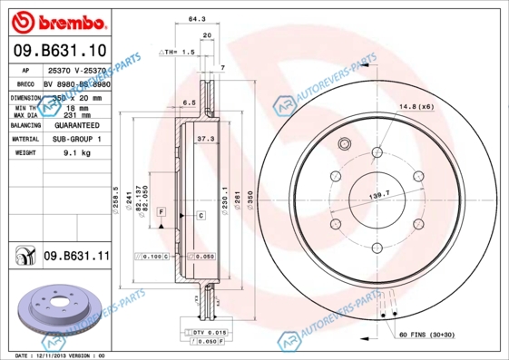Наружный диаметр [мм]:350 | Поверхность:с покрытием | Количество отверстий:6 | Диаметр центрирования [мм]:82 | Высота [мм]:64.3 | Минимальная толщина [мм]:18 | Толщина тормозного диска (мм):20 | Диаметр [мм]:350 | Тип тормозного диска:с внутренней вентиляцией | для артикула №:09.B631.11