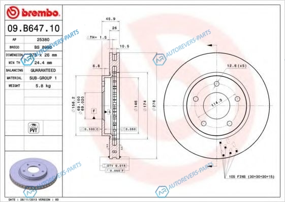 для артикула №:09.B647.10 | Тип тормозного диска:с внутренней вентиляцией | Диаметр [мм]:276 | Толщина тормозного диска (мм):26 | Минимальная толщина [мм]:24.4 | Высота [мм]:45.9 | Диаметр центрирования [мм]:69 | Количество отверстий:5 | Наружный диаметр [мм]:276