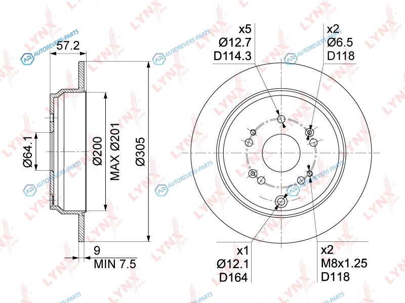 Тип тормозного диска:полный | ? фаски [мм]:114.3 | Количество отверстий:5 | Внутренний диаметр:200 | Высота [мм]:61 | Диаметр центрирования [мм]:64 | Минимальная толщина [мм]:7.5 | Толщина тормозного диска (мм):9 | Диаметр [мм]:304.5 | Сторона установки:задний мост