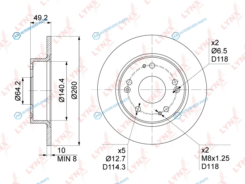 Тип тормозного диска:полный | ? фаски [мм]:114.3 | Количество отверстий:5 | Внутренний диаметр:140.5 | Высота [мм]:49 | Диаметр центрирования [мм]:64 | Минимальная толщина [мм]:8 | Толщина тормозного диска (мм):10 | Диаметр [мм]:260 | Сторона установки:задний мост