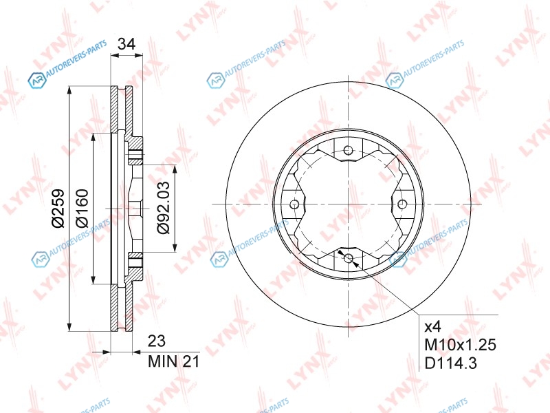 Тип тормозного диска:вентилируемый | ? фаски [мм]:114.3 | Количество отверстий:4 | Внутренний диаметр:160 | Высота [мм]:34 | Диаметр центрирования [мм]:92 | Минимальная толщина [мм]:21 | Толщина тормозного диска (мм):23 | Диаметр [мм]:259.5 | Сторона установки:передний мост