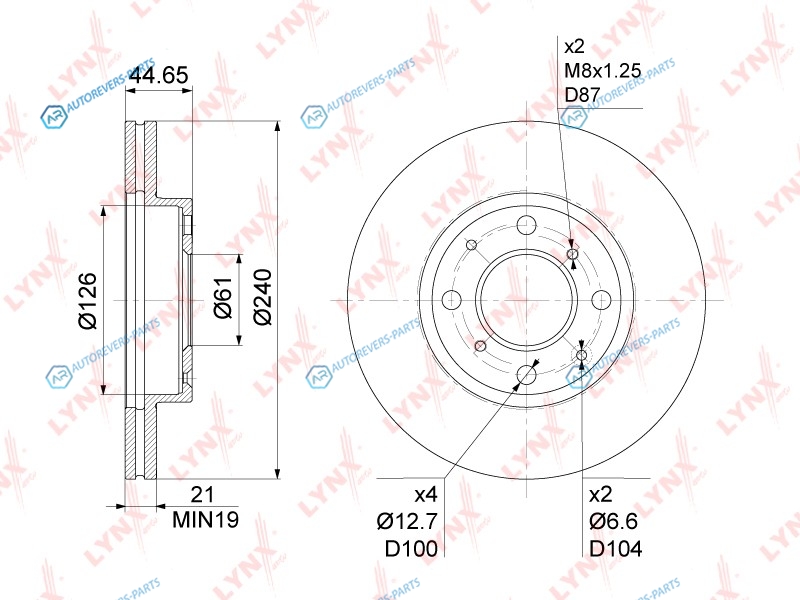 Тип тормозного диска:вентилируемый | ? фаски [мм]:100 | Количество отверстий:4 | Внутренний диаметр:126 | Высота [мм]:45 | Диаметр центрирования [мм]:61 | Минимальная толщина [мм]:19 | Толщина тормозного диска (мм):21 | Диаметр [мм]:240 | Сторона установки:передний мост
