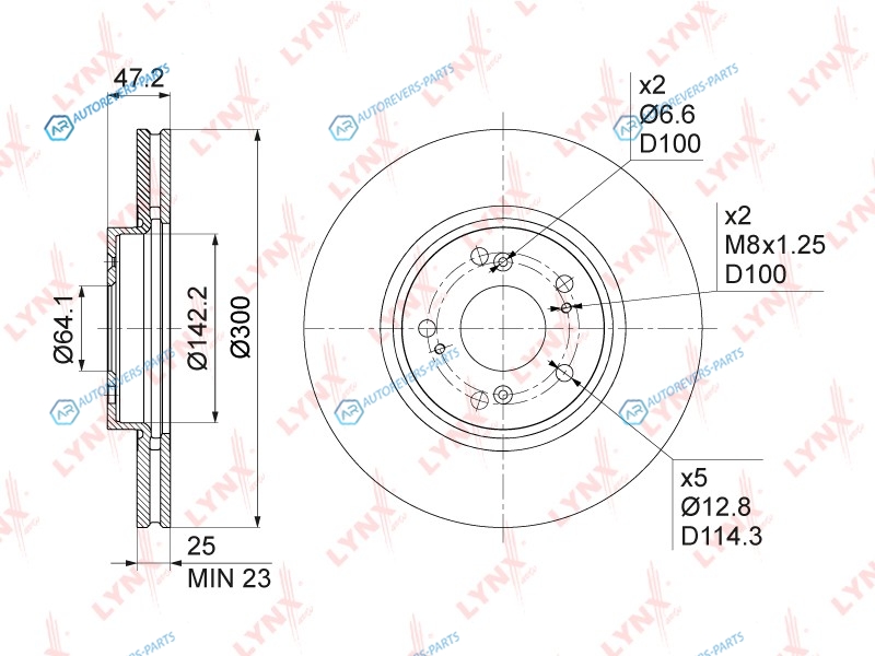 Тип тормозного диска:вентилируемый | ? фаски [мм]:114.3 | Количество отверстий:5 | Внутренний диаметр:142 | Высота [мм]:47 | Диаметр центрирования [мм]:64 | Минимальная толщина [мм]:23 | Толщина тормозного диска (мм):25 | Диаметр [мм]:300 | Сторона установки:передний мост