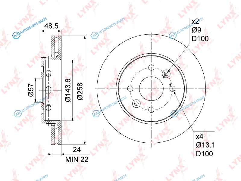 Тип тормозного диска:вентилируемый | ? фаски [мм]:100 | Количество отверстий:4 | Внутренний диаметр:143.5 | Высота [мм]:48.5 | Диаметр центрирования [мм]:57 | Минимальная толщина [мм]:22 | Толщина тормозного диска (мм):24 | Диаметр [мм]:258 | Сторона установки:передний мост