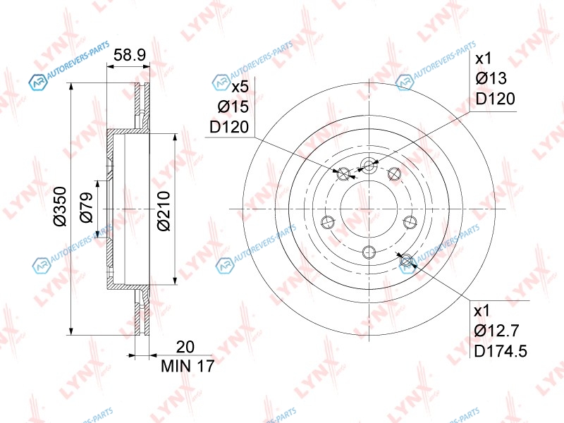 Сторона установки:задний мост | Диаметр [мм]:350 | Толщина тормозного диска (мм):20 | Минимальная толщина [мм]:17 | Диаметр центрирования [мм]:79 | Высота [мм]:59 | Внутренний диаметр:210 | Количество отверстий:5 | ? фаски [мм]:120 | Тип тормозного диска:вентилируемый