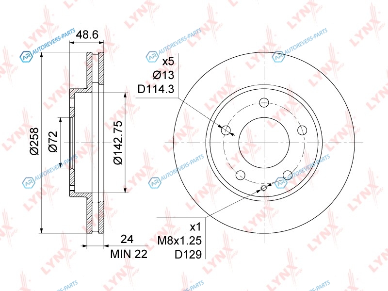 Тип тормозного диска:вентилируемый | ? фаски [мм]:114.3 | Количество отверстий:5 | Внутренний диаметр:142.5 | Высота [мм]:48.5 | Диаметр центрирования [мм]:72 | Минимальная толщина [мм]:22 | Толщина тормозного диска (мм):24 | Диаметр [мм]:258 | Сторона установки:передний мост