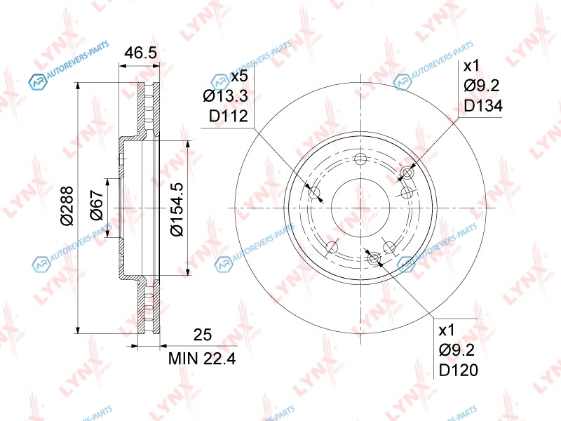 Тип тормозного диска:вентилируемый | ? фаски [мм]:112 | Количество отверстий:5 | Внутренний диаметр:154 | Высота [мм]:46.5 | Диаметр центрирования [мм]:67 | Минимальная толщина [мм]:22.4 | Толщина тормозного диска (мм):25 | Диаметр [мм]:288 | Сторона установки:передний мост