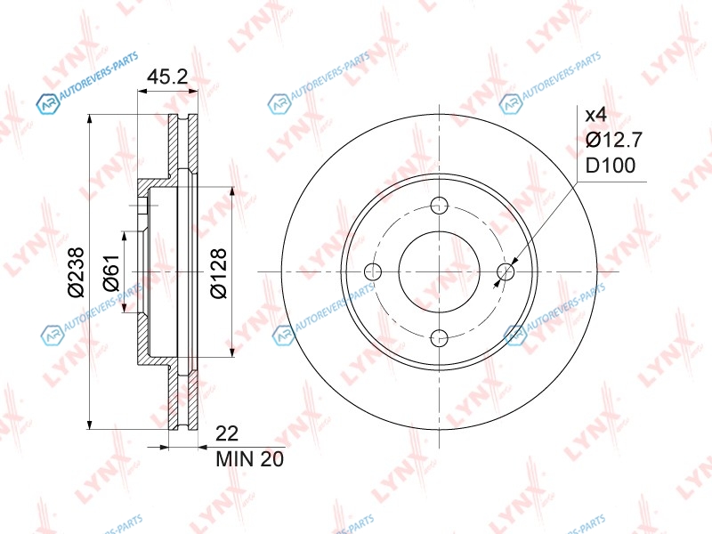 Тип тормозного диска:вентилируемый | ? фаски [мм]:100 | Количество отверстий:4 | Внутренний диаметр:128 | Высота [мм]:45 | Диаметр центрирования [мм]:61 | Минимальная толщина [мм]:20 | Толщина тормозного диска (мм):22 | Диаметр [мм]:237.5 | Сторона установки:передний мост