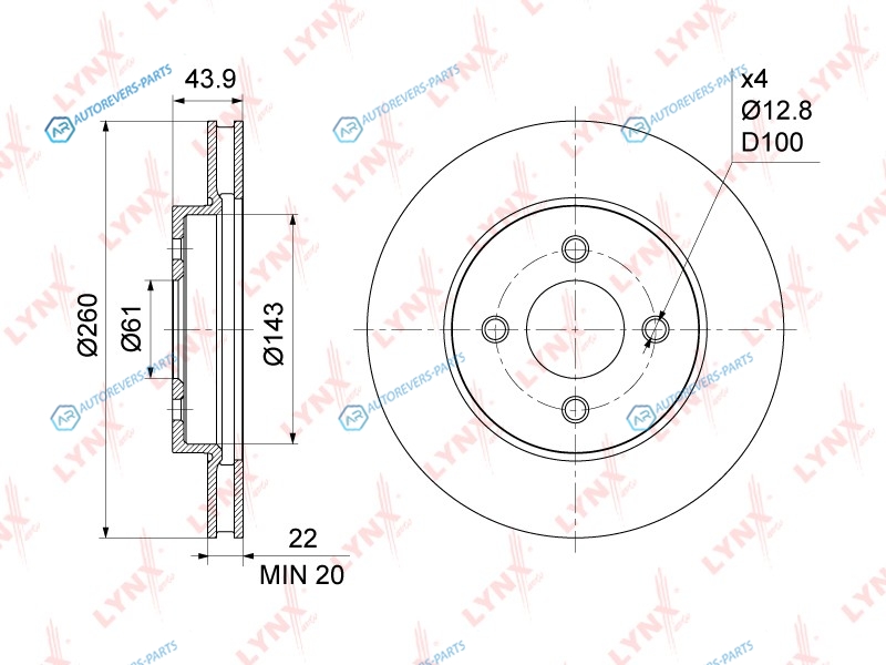 Тип тормозного диска:вентилируемый | ? фаски [мм]:100 | Количество отверстий:4 | Высота [мм]:44 | Диаметр центрирования [мм]:61 | Минимальная толщина [мм]:20 | Толщина тормозного диска (мм):22 | Диаметр [мм]:260 | Сторона установки:передний мост