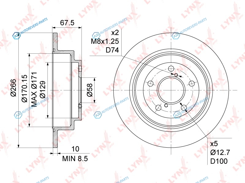 Сторона установки:задний мост | Диаметр [мм]:266 | Толщина тормозного диска (мм):10 | Минимальная толщина [мм]:8.5 | Диаметр центрирования [мм]:58 | Высота [мм]:67.5 | Внутренний диаметр:170 | Количество отверстий:5 | ? фаски [мм]:100 | Тип тормозного диска:полный