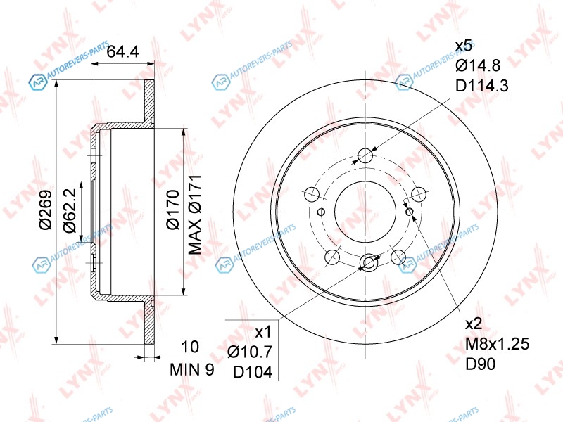 Тип тормозного диска:полный | ? фаски [мм]:114.3 | Количество отверстий:5 | Внутренний диаметр:170 | Высота [мм]:64.5 | Диаметр центрирования [мм]:62 | Минимальная толщина [мм]:9 | Толщина тормозного диска (мм):10 | Диаметр [мм]:269 | Сторона установки:задний мост