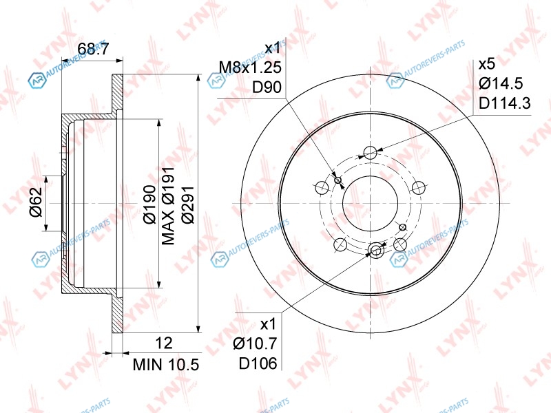 Тип тормозного диска:полный | ? фаски [мм]:114.3 | Количество отверстий:5 | Внутренний диаметр:190 | Высота [мм]:69 | Диаметр центрирования [мм]:62 | Минимальная толщина [мм]:10.5 | Толщина тормозного диска (мм):12 | Диаметр [мм]:291 | Сторона установки:задний мост