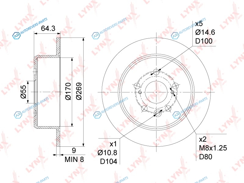 Тип тормозного диска:полный | ? фаски [мм]:100 | Количество отверстий:5 | Высота [мм]:64 | Диаметр центрирования [мм]:55 | Минимальная толщина [мм]:8 | Толщина тормозного диска (мм):9 | Диаметр [мм]:269 | Сторона установки:задний мост