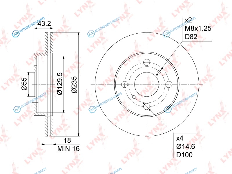 Сторона установки:передний мост | Диаметр [мм]:235 | Толщина тормозного диска (мм):18 | Минимальная толщина [мм]:16 | Диаметр центрирования [мм]:55 | Высота [мм]:43 | Внутренний диаметр:129.5 | Количество отверстий:4 | ? фаски [мм]:100 | Тип тормозного диска:вентилируемый