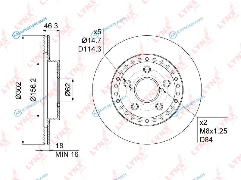 Сторона установки:передний мост | Диаметр [мм]:302 | Толщина тормозного диска (мм):18 | Минимальная толщина [мм]:16 | Диаметр центрирования [мм]:62 | Высота [мм]:46 | Внутренний диаметр:157 | Количество отверстий:5 | ? фаски [мм]:114.3 | Тип тормозного диска:вентилируемый
