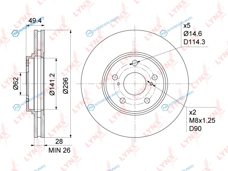 Тип тормозного диска:вентилируемый | ? фаски [мм]:114.3 | Количество отверстий:5 | Внутренний диаметр:141 | Высота [мм]:49 | Диаметр центрирования [мм]:62 | Минимальная толщина [мм]:26 | Толщина тормозного диска (мм):28 | Диаметр [мм]:296 | Сторона установки:передний мост