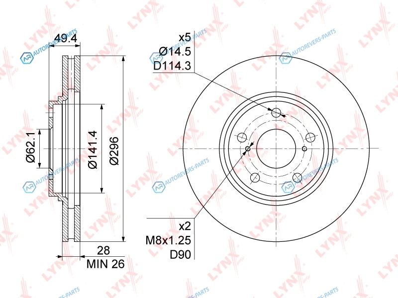 Тип тормозного диска:вентилируемый | ? фаски [мм]:114.3 | Количество отверстий:5 | Внутренний диаметр:141 | Высота [мм]:49.5 | Диаметр центрирования [мм]:62 | Минимальная толщина [мм]:26 | Толщина тормозного диска (мм):28 | Диаметр [мм]:296 | Сторона установки:передний мост