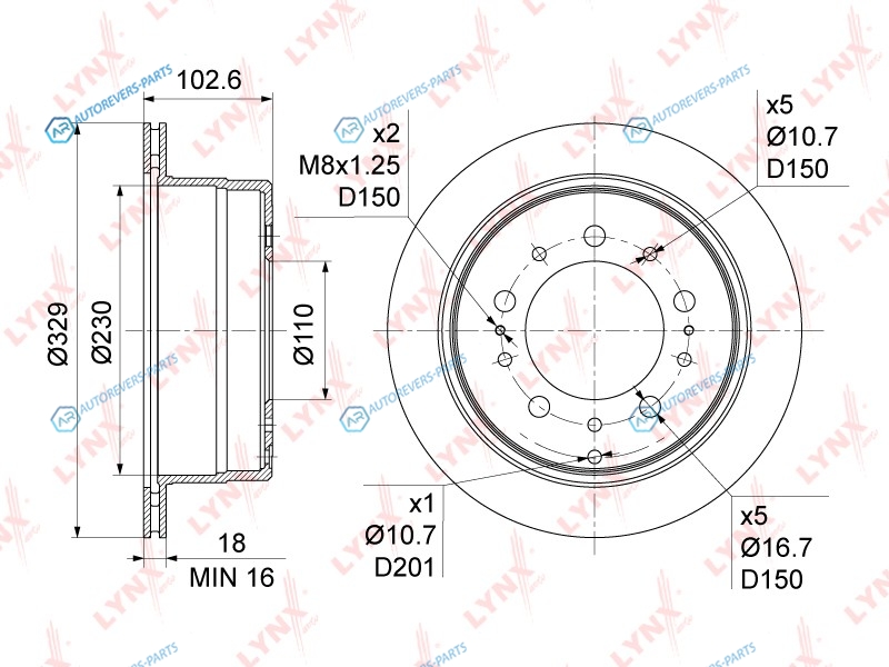 Тип тормозного диска:вентилируемый | ? фаски [мм]:150 | Количество отверстий:5 | Внутренний диаметр:230 | Высота [мм]:102.5 | Диаметр центрирования [мм]:110 | Минимальная толщина [мм]:16 | Толщина тормозного диска (мм):18 | Диаметр [мм]:329 | Сторона установки:задний мост
