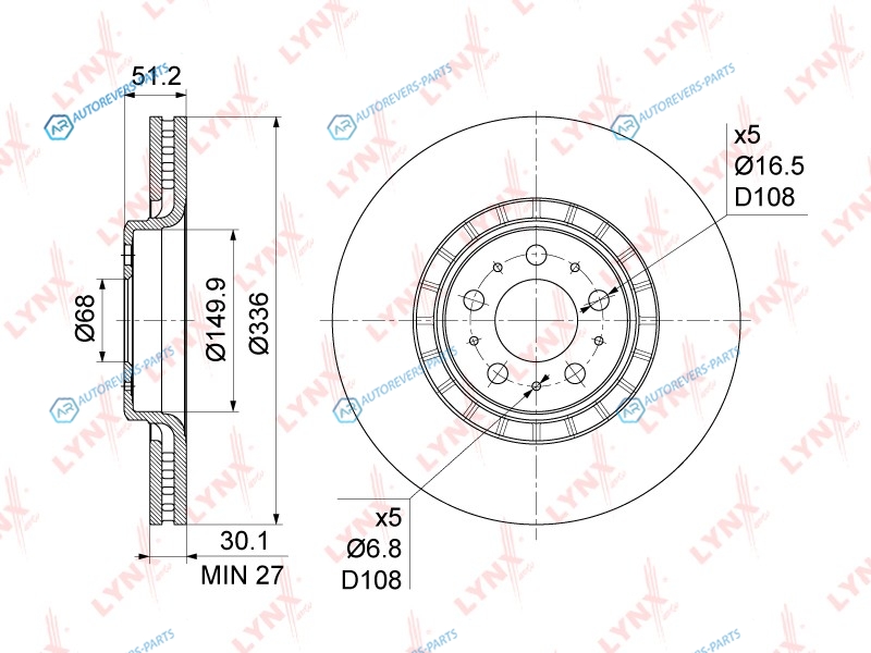 Тип тормозного диска:вентилируемый | ? фаски [мм]:108 | Количество отверстий:5 | Внутренний диаметр:150 | Высота [мм]:51 | Диаметр центрирования [мм]:68 | Минимальная толщина [мм]:27 | Толщина тормозного диска (мм):30 | Диаметр [мм]:336 | Сторона установки:передний мост