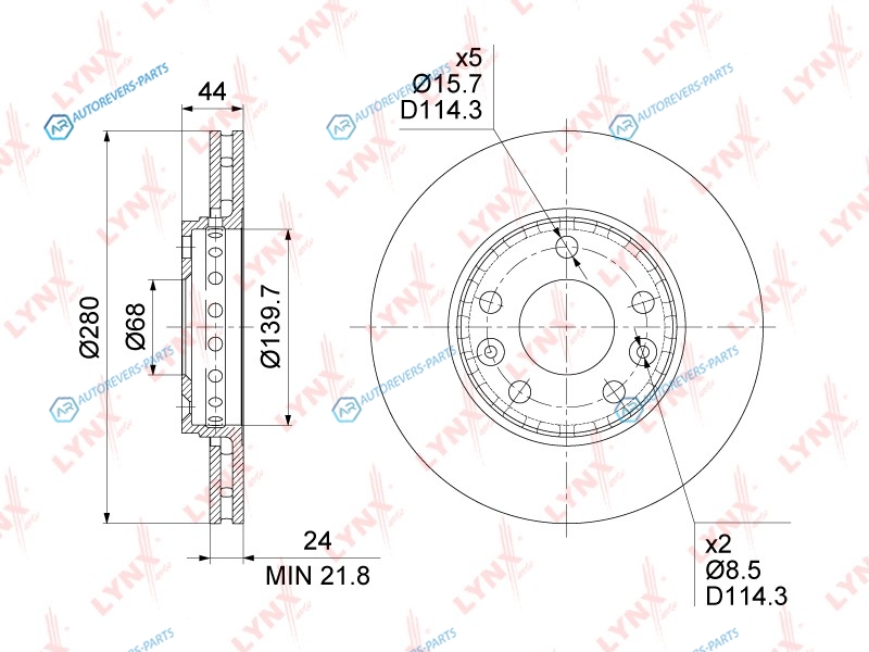Сторона установки:передний мост | Диаметр [мм]:280 | Толщина тормозного диска (мм):24 | Минимальная толщина [мм]:21.8 | Диаметр центрирования [мм]:68 | Высота [мм]:44 | Количество отверстий:5 | ? фаски [мм]:114.3 | Тип тормозного диска:вентилируемый