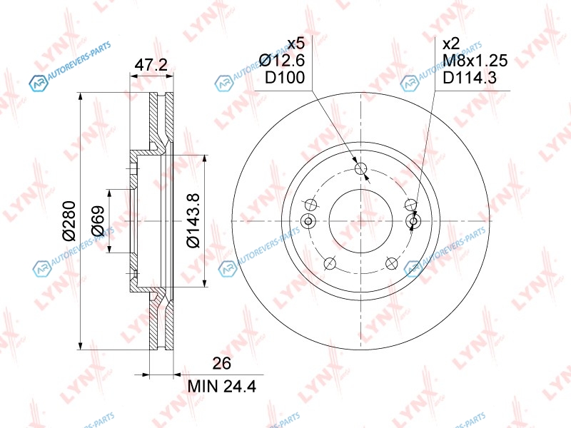 Тип тормозного диска:вентилируемый | ? фаски [мм]:114.3 | Количество отверстий:5 | Внутренний диаметр:143.5 | Высота [мм]:47 | Диаметр центрирования [мм]:69 | Минимальная толщина [мм]:24 | Толщина тормозного диска (мм):26 | Диаметр [мм]:280 | Сторона установки:передний мост