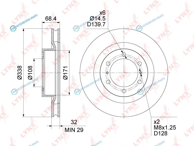 Сторона установки:передний мост | Диаметр [мм]:338 | Толщина тормозного диска (мм):32 | Минимальная толщина [мм]:29 | Диаметр центрирования [мм]:108 | Высота [мм]:68.5 | Количество отверстий:6 | ? фаски [мм]:128 | Тип тормозного диска:вентилируемый