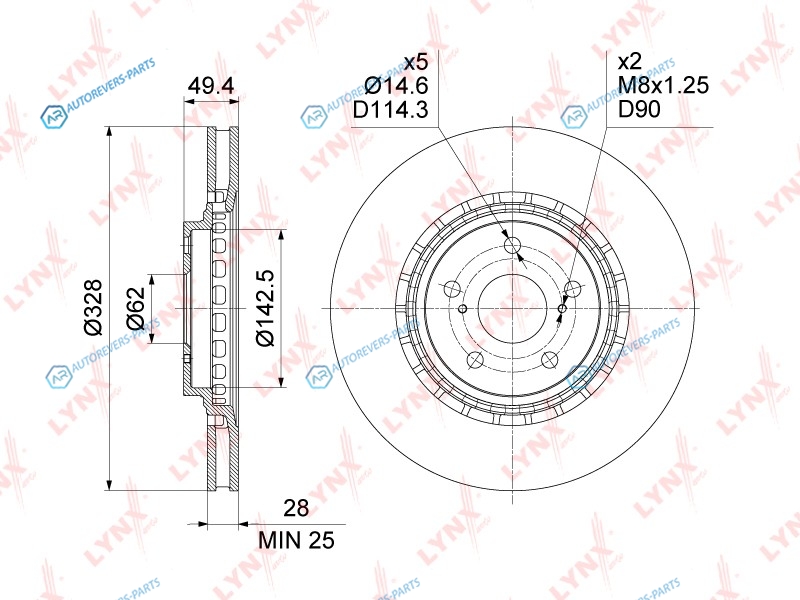 Тип тормозного диска:вентилируемый | ? фаски [мм]:114.3 | Количество отверстий:5 | Высота [мм]:49.5 | Диаметр центрирования [мм]:62 | Минимальная толщина [мм]:25 | Толщина тормозного диска (мм):28 | Диаметр [мм]:328 | Сторона установки:передний мост
