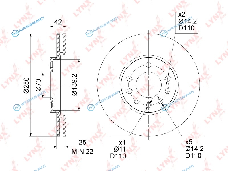 Сторона установки:передний мост | Диаметр [мм]:280 | Толщина тормозного диска (мм):25 | Минимальная толщина [мм]:22 | Диаметр центрирования [мм]:70 | Высота [мм]:42 | Количество отверстий:5 | ? фаски [мм]:110 | Тип тормозного диска:вентилируемый