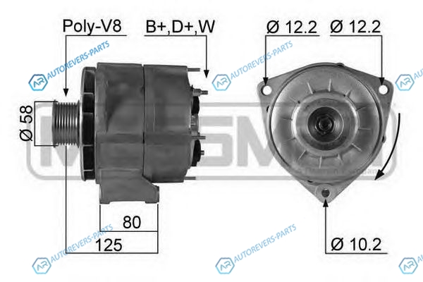 Напряжение [В]:14 | ток зарядки от генератора (А):110 | для артикула №:210308 | Идентификационный номер исполнения штекерного разъема:B+CLFR | ? шкива [мм]:58 | Ременной шкив:с клиноремённым шкифом ребёрным | Направление вращения:по часовой стрелке | Количество крепежных отверстий:2 | Количество канавок:6 | Расстояние от ременного шкива до генератора [мм]:43