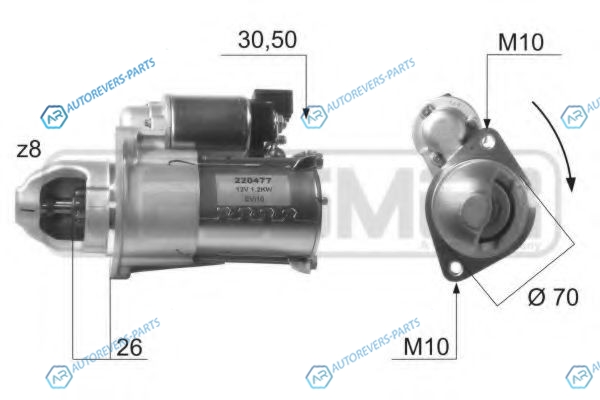 для артикула №:220477 | Напряжение [В]:12 | Мощность стартера [кВт]:1.2 | Число зубцов:8 | Идентификационный номер исполнения штекерного разъема:30-50 | Направление вращения:по часовой стрелке | ? фланца [мм]:70 | Количество крепежных отверстий:2 | Ведущая шестерня - основная позиция [мм]:26