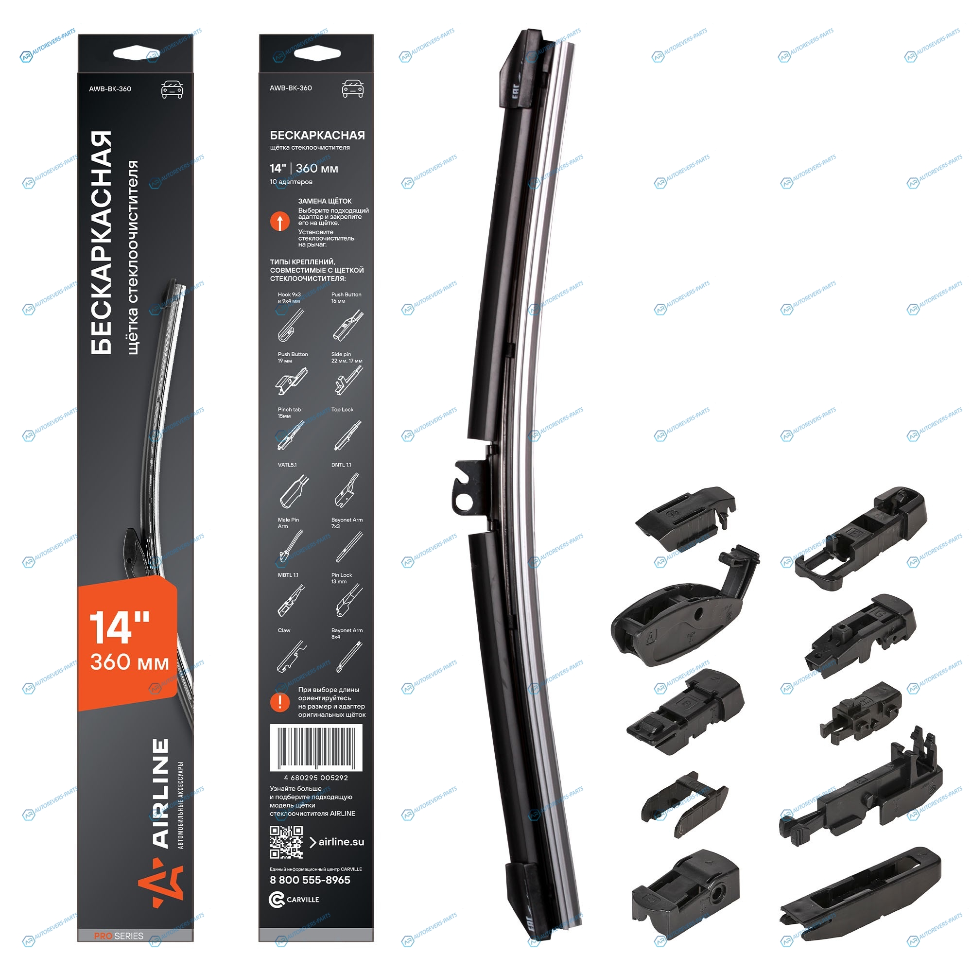 AWB-BK-360 Щетка стеклоочистителя 360 мм (14) бескаркасная. 10 адаптеров